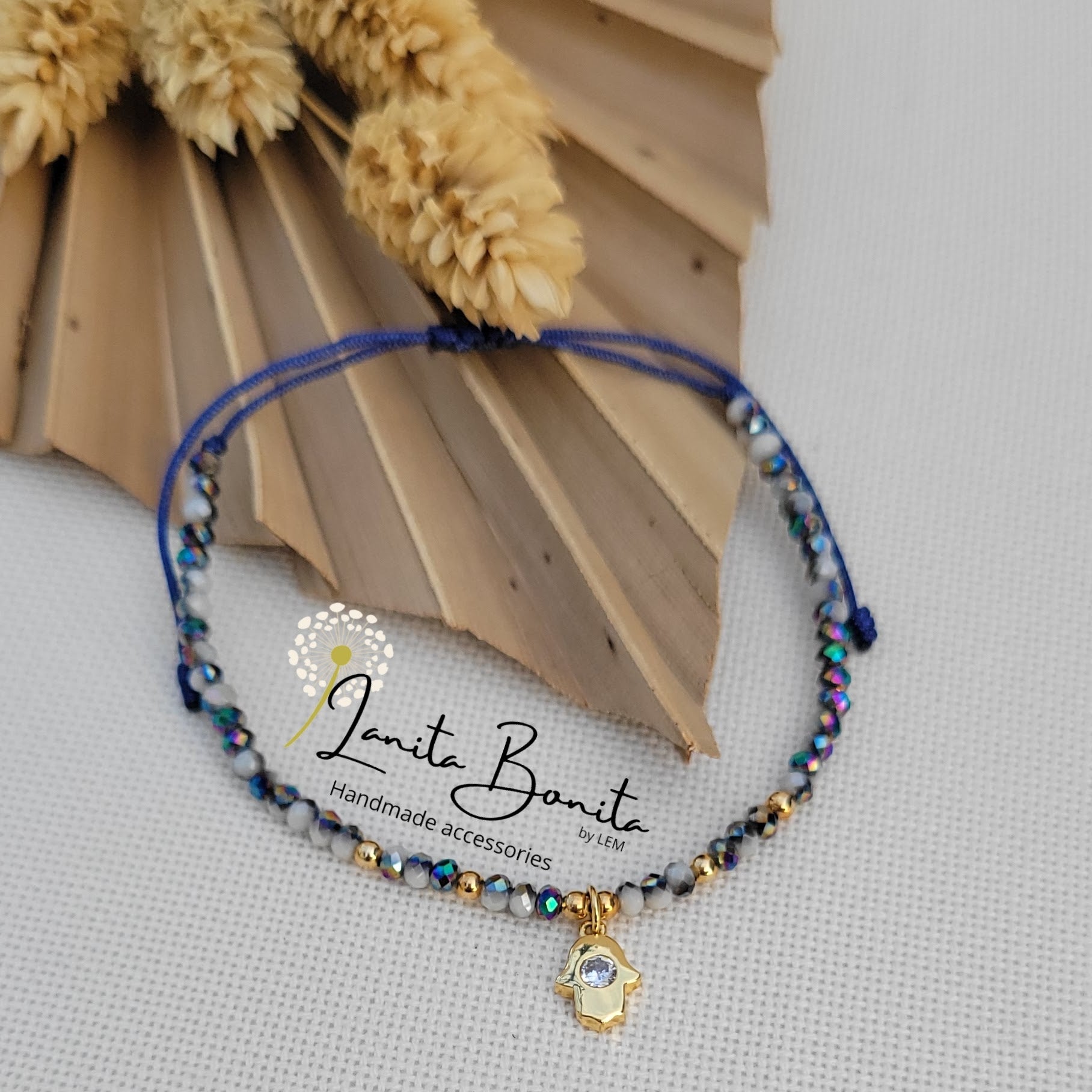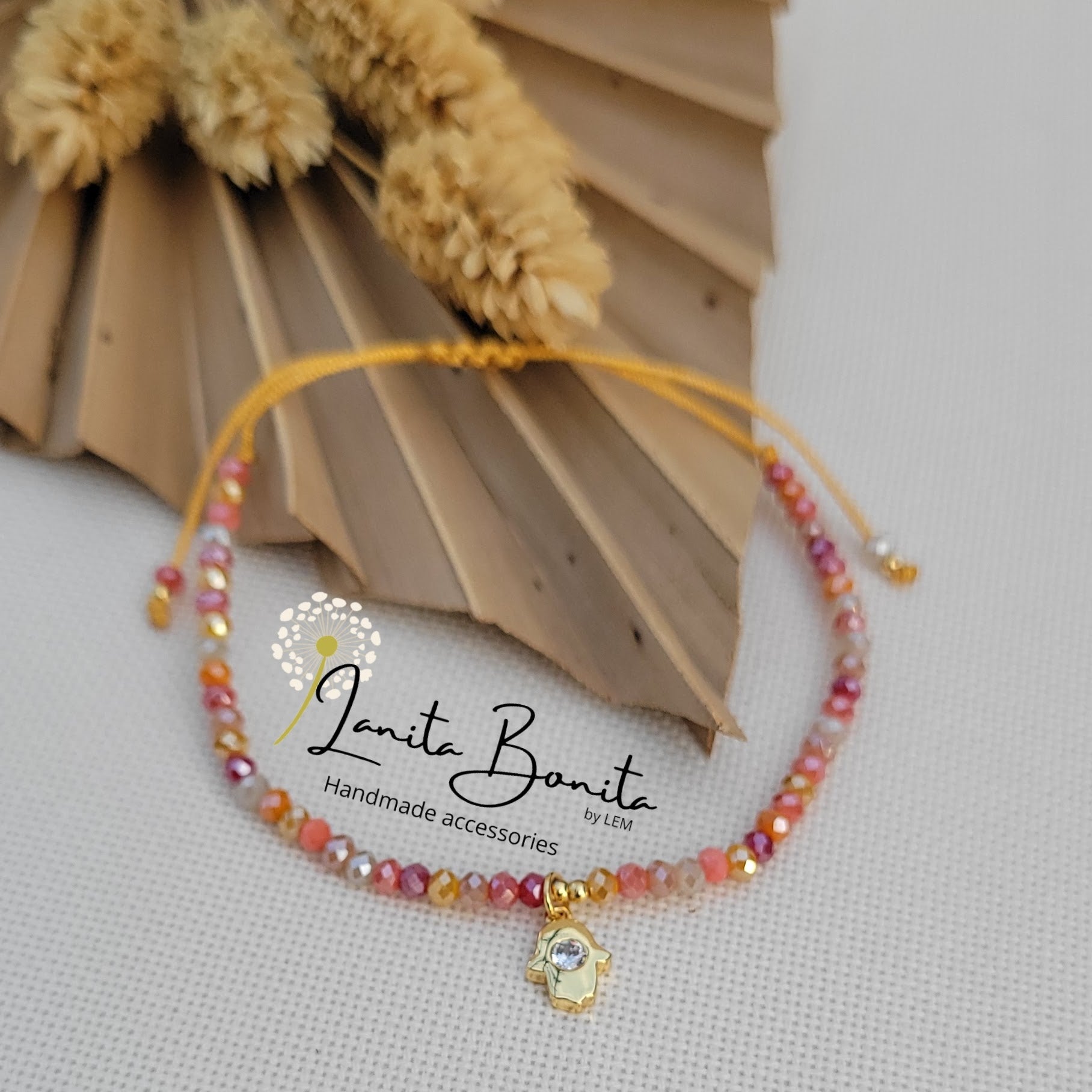 Material: Glass rondelle beads, stainless steel, gold plated, zirconia and chinese thread.