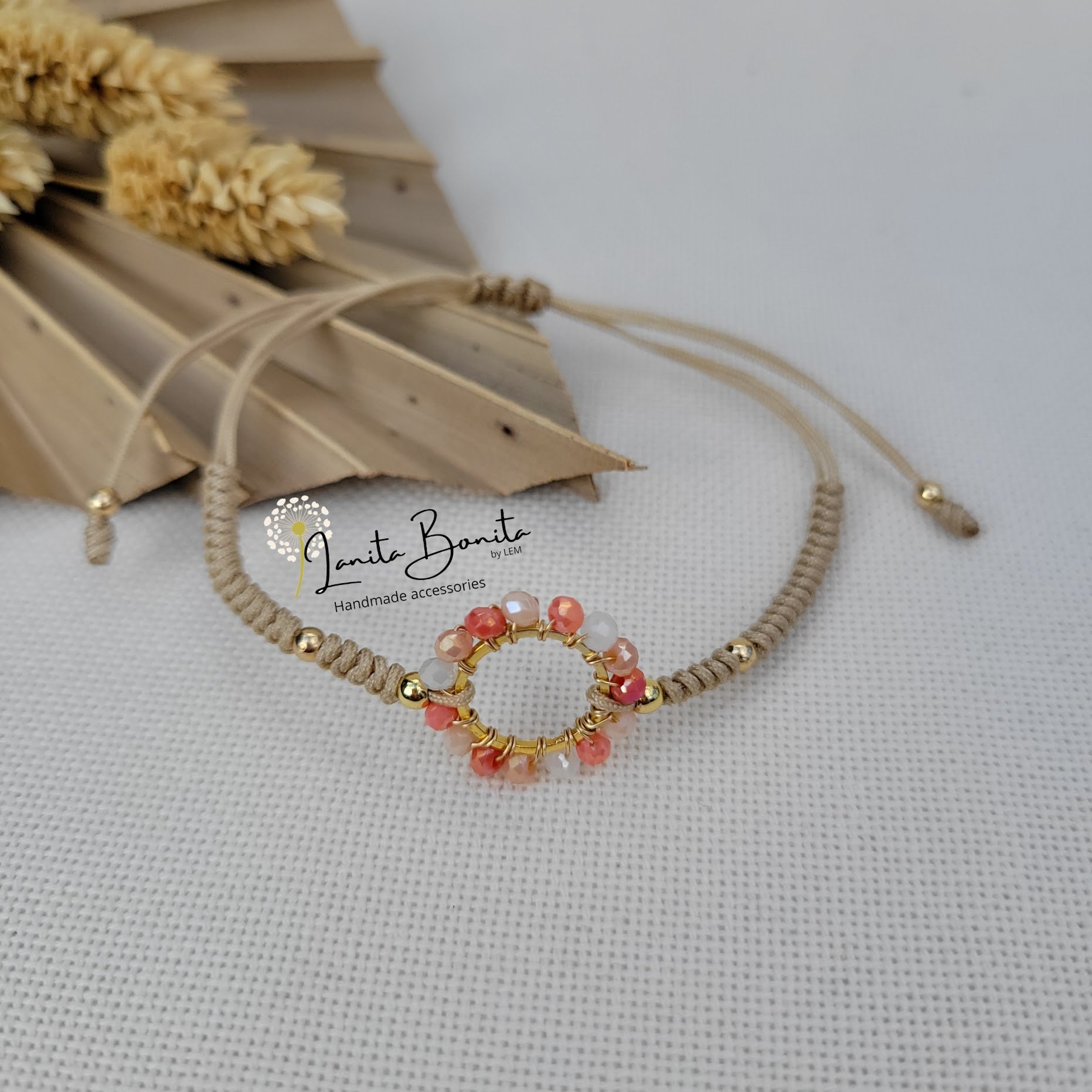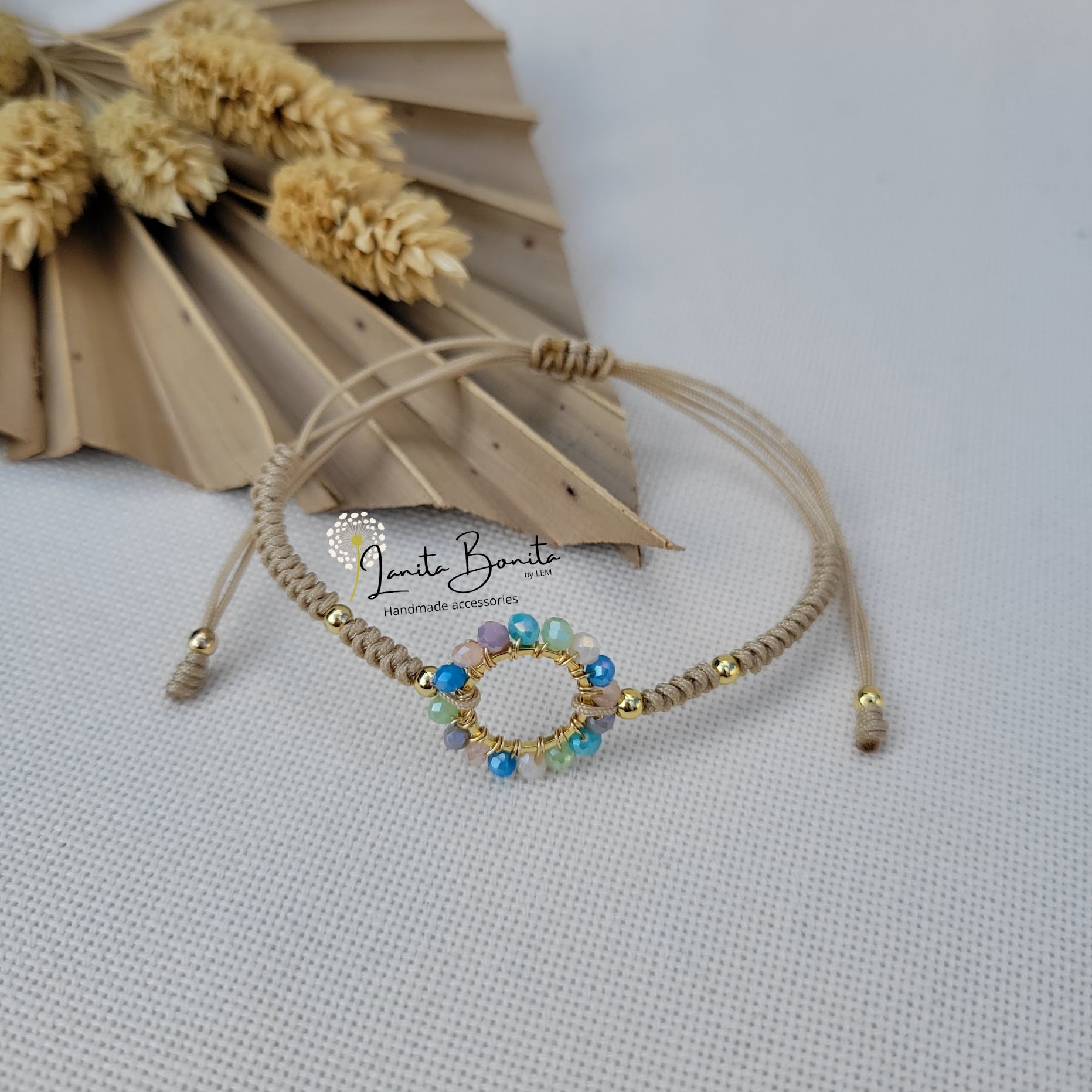 Material: Glass rondelle beads, stainless steel, gold plated and chinese thread.