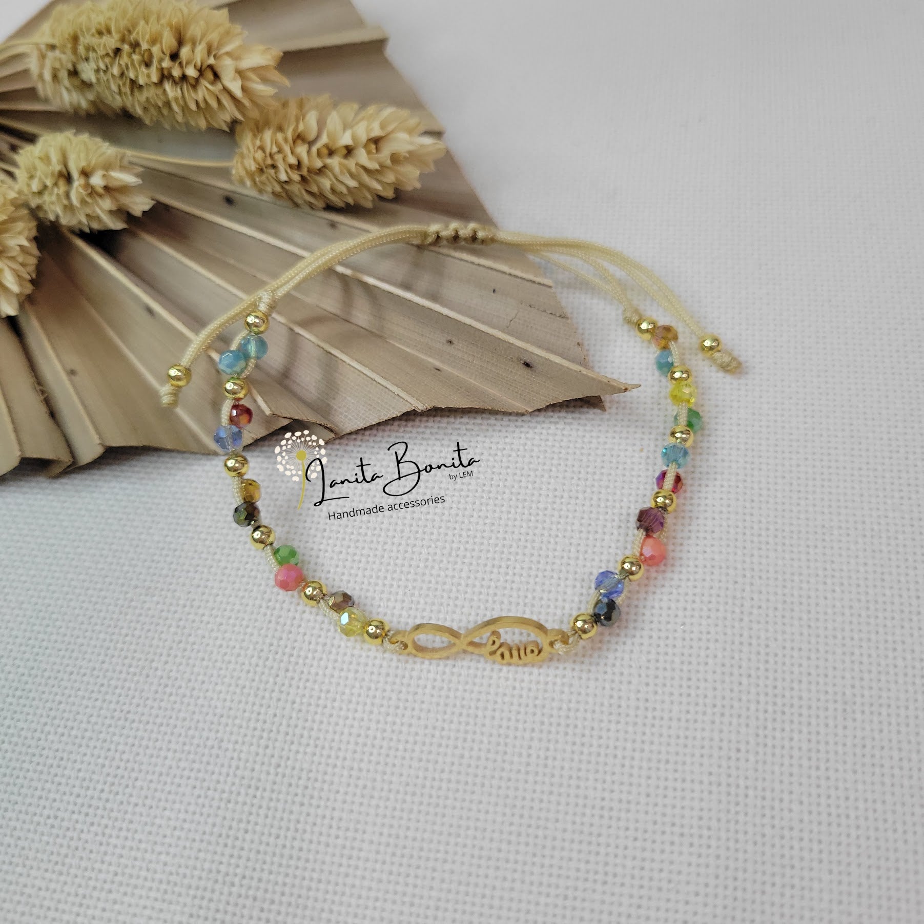 Material: Glass rondelle beads, stainless steel gold plated and chinese thread.