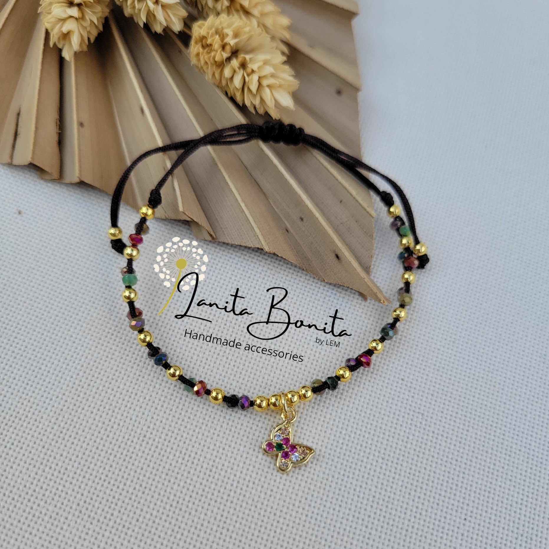 Material: Glass rondelle beads, stainless steel, gold plated, zirconia and chinese thread.