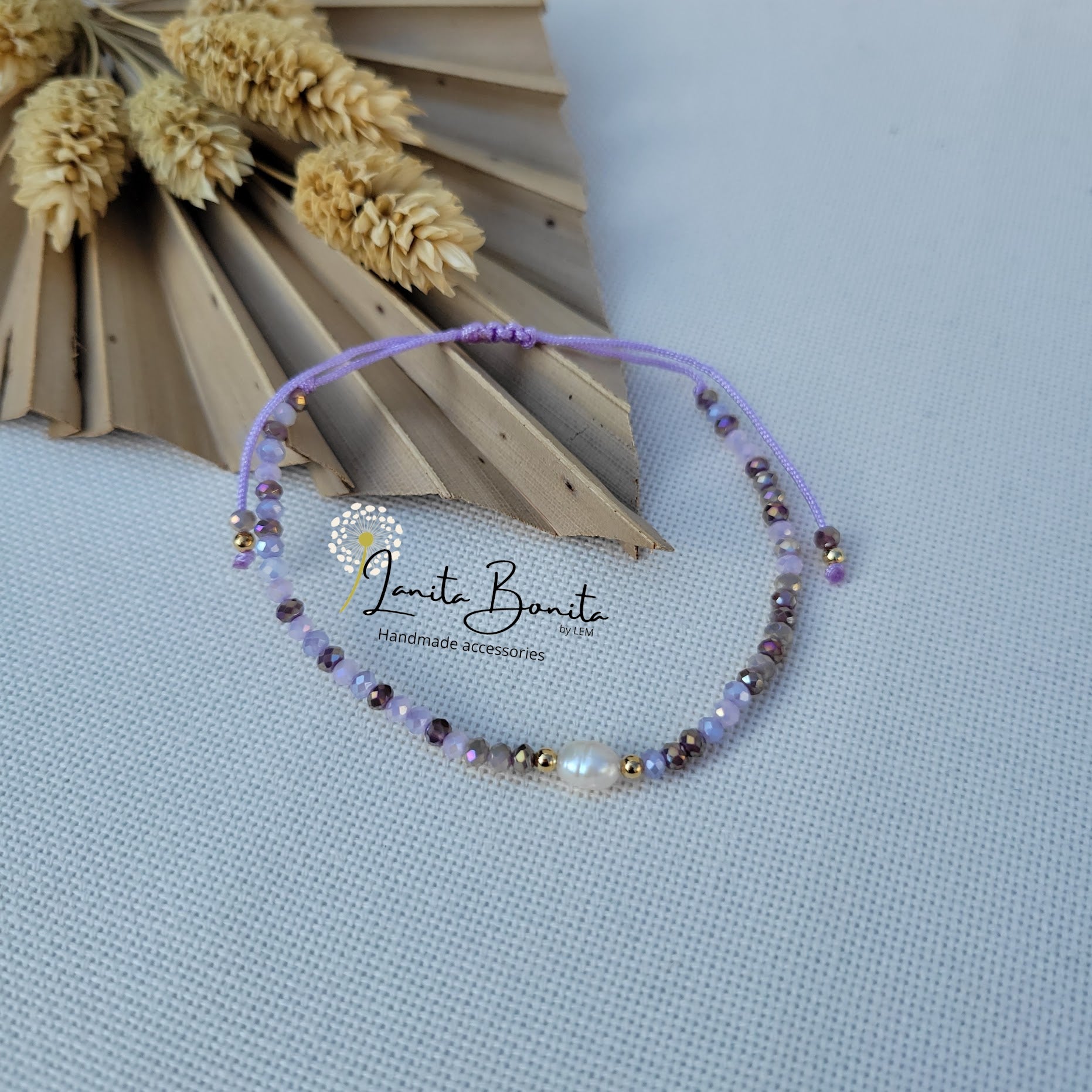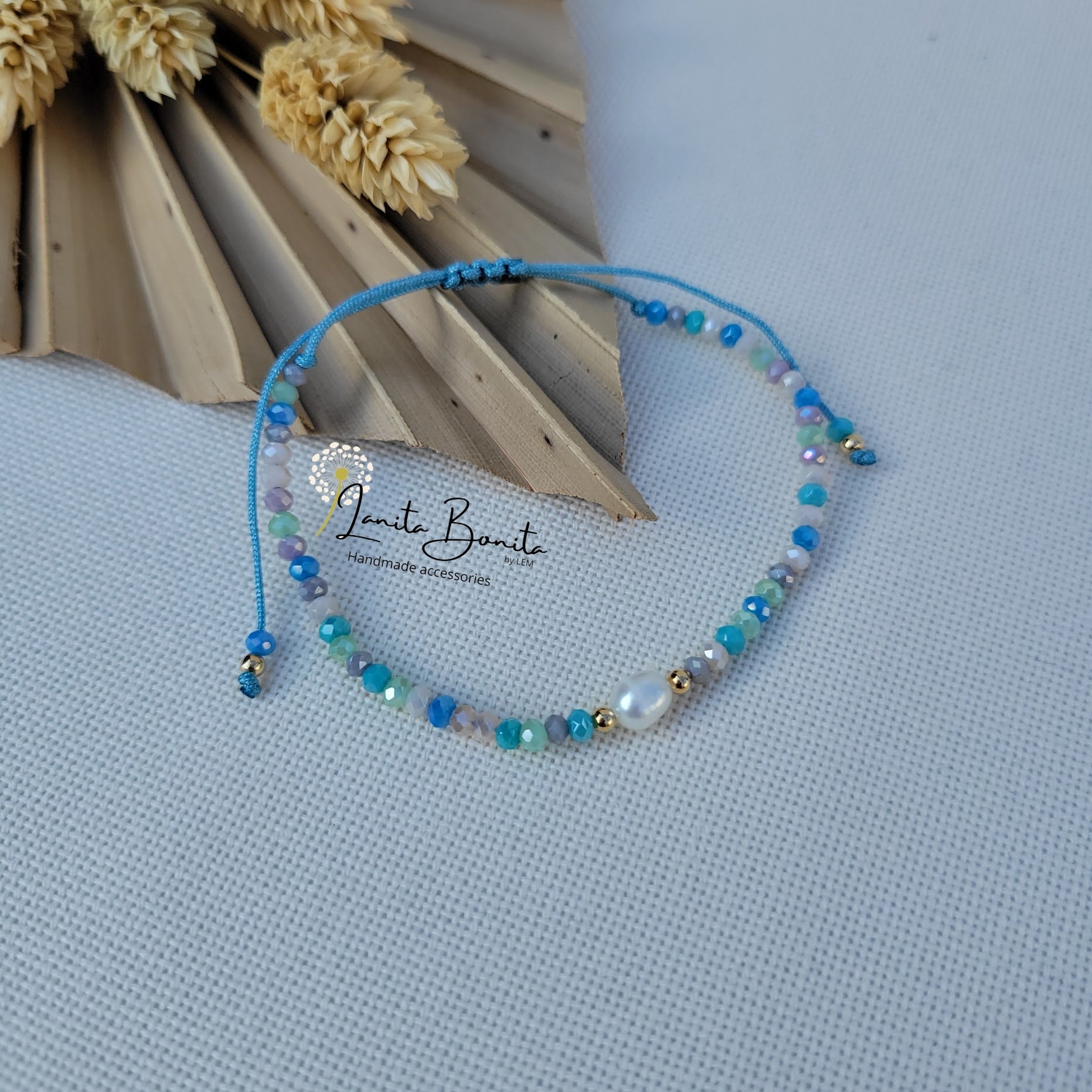 Material: Glass rondelle beads, cultured pearl, gold plated, and chinese thread.